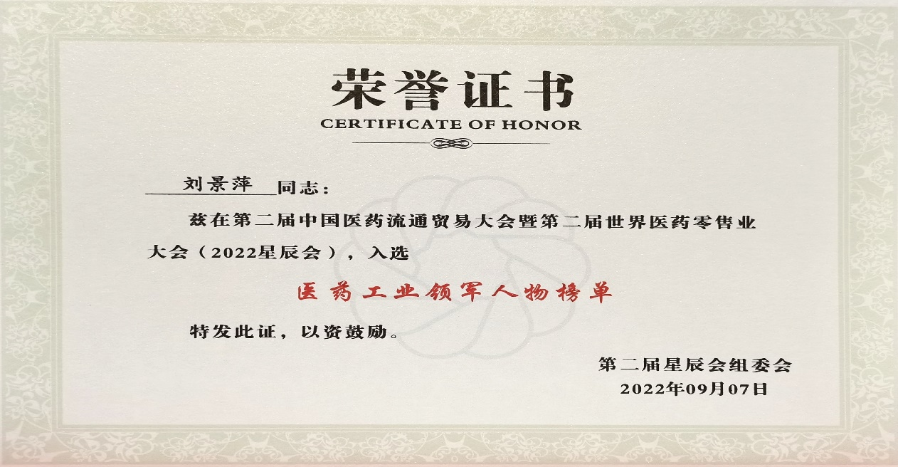 本次星辰会期间,尊龙凯时斩获颇丰,获得多项行业奖项及荣誉。在开幕式上,刘景萍董事长荣获“医药工业领军人物”称号。